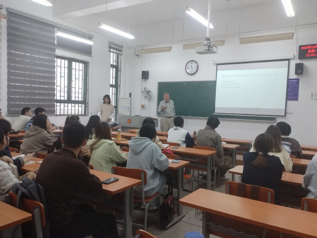 2024年10月28日下午,公司2022级劳动与社会保障专业的《医疗保险学》课堂迎来了美国佛罗里达大学汉密尔顿教授为同学们授课,本次授课安排是公司“专家进课堂”系列活动之一,由课程负责人严妮老师全程主持。
