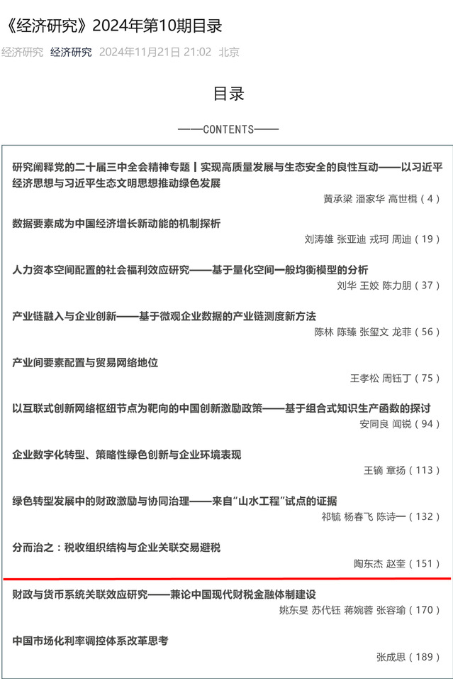近日,伟德BV1946官网再传捷报。公司副经理、湖北地方税收研究中心研究员陶东杰副教授作为第一作者与华中科技大学管理公司赵奎副教授合作完成的学术论文《分而治之:税收组织结构与企业关联交易避税》,在中文顶级期刊《经济研究》2024年第10期正式发表。这是公司以“深化税收征管改革”为主题开展的系列研究取得的又一重要成果。