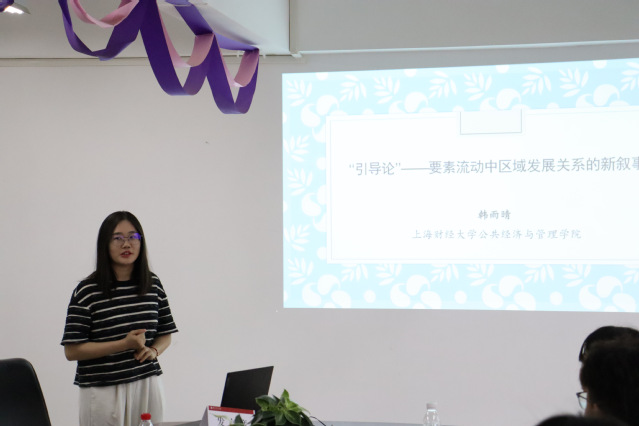 四位青年博士就所研究的领域分别做了主旨演讲。上海财经大学公共经济与管理公司韩雨晴博士汇报了论文《“引导论”——要素流动中区域发展关系的新叙事》。她从要素聚集的原因和结果、户籍制度的性质和目的、要素聚集和合理人口流动规模、央地关系和区域平衡政策等四个方面对“禀赋论”与“引导论”进行了对比分析。进一步地,在构建理论模型的基础上,她发现户籍(公共服务分担比例)与要素投入是一个“拉弗曲线”关系,随着要素流动障碍减少,中央与地方政府目标从一致走向分化,引致政策从集聚导向转为全国统一大市场下导向。
