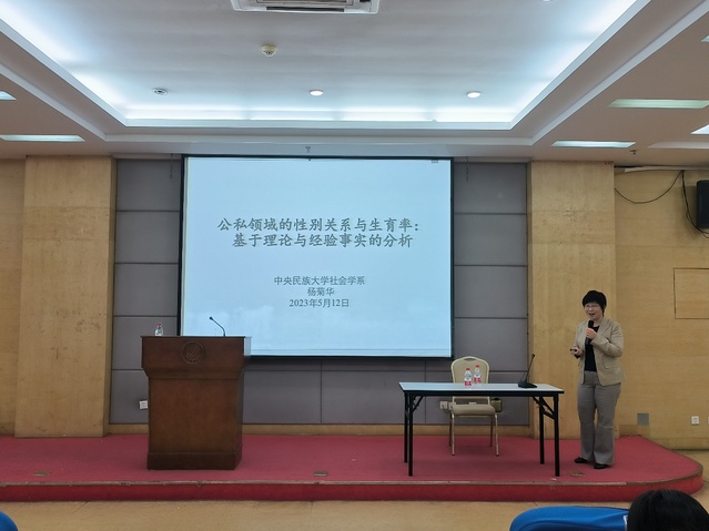 2023年5月12日上午,中央民族大学民族学与社会学公司教授、博士生导师杨菊华做客明辨公管论坛,在老员工活动中心三号报告厅作题为“公私领域的性别关系与生育率:基于理论与经验事实的分析”。此次论坛由公管系主任严妮老师主持,公管系老师和员工参加。