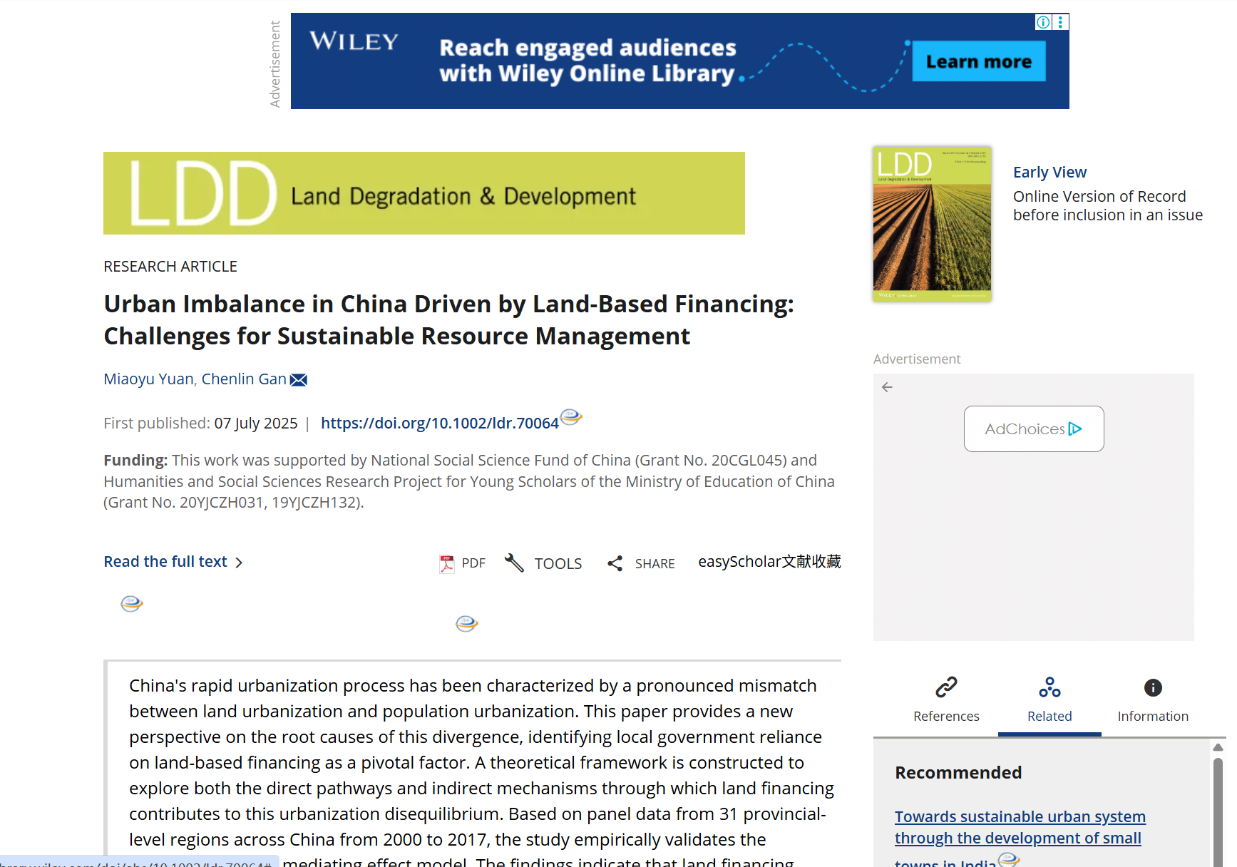 近日,公司袁妙彧老师与甘臣林老师合作的论文《Urban Imbalance in China Driven by Land-Based Financing: Challenges for Sustainable Resource Management》(土地融资驱动下的中国城市发展失衡:可持续资源管理面临的挑战)发表于国际知名期刊Land Degradation & Development(SCI/SSCI二区,Wiley出版)。