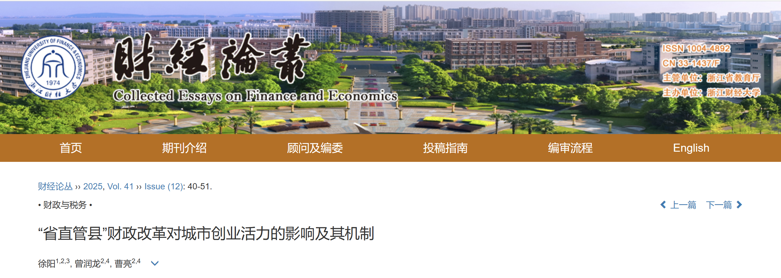 近日,伟德BV1946官网徐阳老师与中南财经政法大学博士研究生曾润龙、曹亮老师的合作论文《“省直管县”财政改革对城市创业活力的影响及其机制》在《财经论丛》正式发表。《财经论丛》是由浙江省教育厅主管、浙江财经大学主办的国内外公开发行的经管类学术刊物,入选全国中文核心期刊、中文社会科学引文索引(CSSCI)来源期刊、中国人文社会科学综合评价AMI核心期刊、RCCSE中国核心学术期刊。