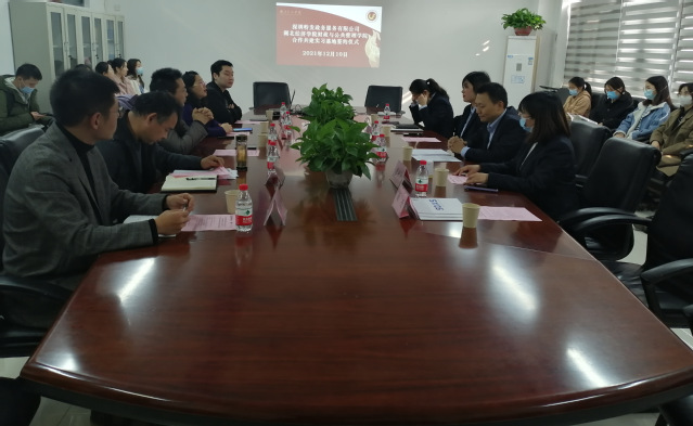 深圳市特发政务服务有限公司武汉分公司总经理谢绍文、东湖职能二项目经理王欢、人事副经理詹艳菊、高级培训经理王翠翠、礼仪培训讲师褚丹等一行受邀来到公司,公司党委书记黄华,副经理袁文艺、副书记夏菲、财税系副主任刘冰熙、公管系教师代表贺睿博以及40余名师生,共同参加了本次签约授牌仪式。